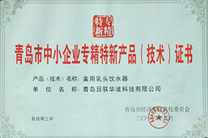 青島日聯(lián)華波科技有限公司禽用乳頭飲水器獲得青島市經(jīng)濟(jì)和信息化委員會(huì)青島市中小企業(yè)專精特新產(chǎn)品(技術(shù))證書;